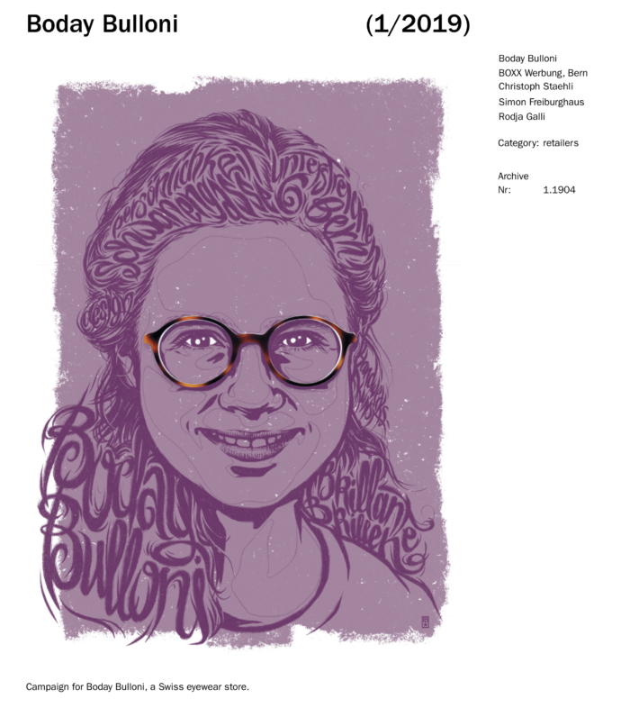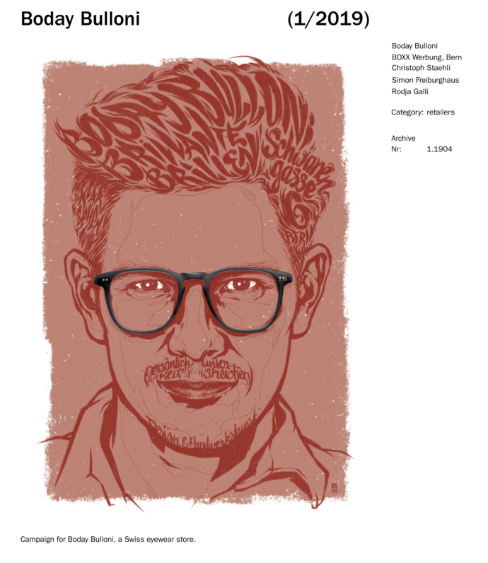 Mit der aktuellen Kampagne erreichte Christoph Stähli nun einen weiteren Höhepunkt in seinem Schaffen für Boday Bulloni. Denn die Plakatserie «Die Kunst des guten Sehens (the new art of sight)» wurde in die neuste Ausgabe des international renommierten Design- und Werbefachmagazin Luerzers Archive in der Kategorie Einzelhandel aufgenommen.
